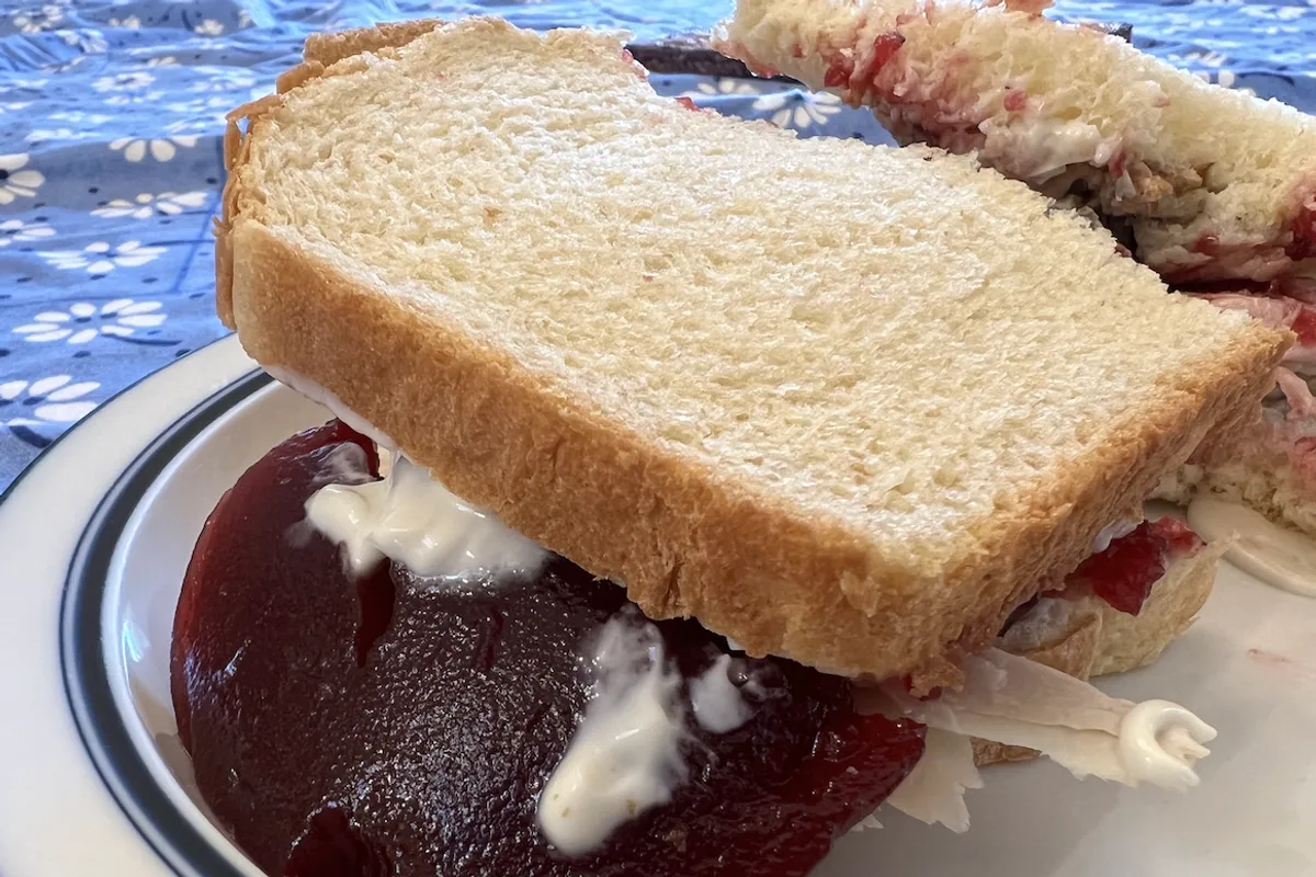 He then tells us to mix our leftover cranberries with mayo — to prevent things from getting soggy — and then spread the mixture on the toasted bread. (Oh, got any herbs on hand? They're good for that cranberry-mayo spread too.)