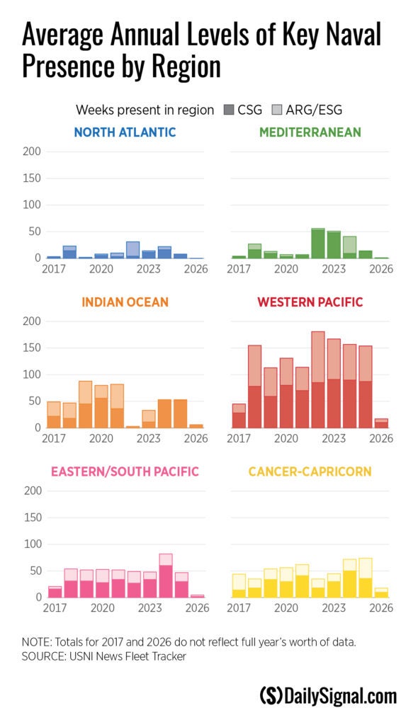 Each week, the U.S. Naval Institute Fleet Tracker has for years been reporting roughly 100 U.S. Navy warships deployed overseas. This total of warships deployed has remained remarkably consistent from the 1980s through today. But the fleet supporting that presence has been halved. In the late Cold War, the Navy peaked at 594 battle?force ships in 1987. Today’s fleet hovers around 293 ships, which is well below what is assessed as necessary by The Heritage Foundation’s 2026 Index of U.S. Military Strength.