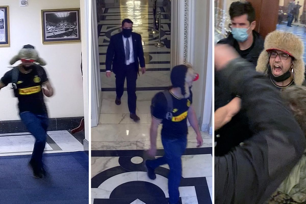 Rioter Zachary Jordan Alam (wearing helmet) is confronted by protesters minutes after the fatal shooting of Air Force veteran Ashli Babbitt on Jan. 6, 2021.