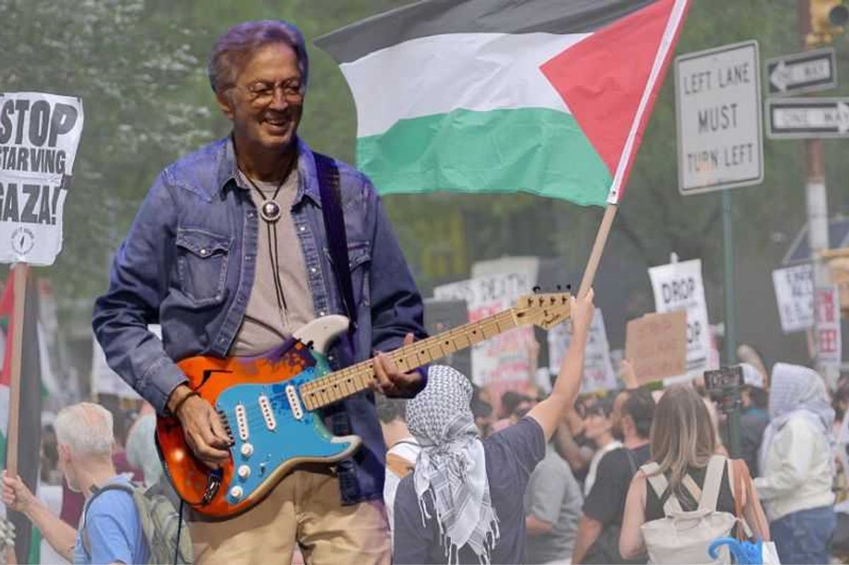 After a few thank-yous, Peled wasted no time before introducing the night's star attraction. Clapton, who much earlier in his career urged his countrymen to "keep Britain white" by expelling the "w*gs" and "c**ns" turning it into a "black colony," now aimed his guitar — a Fender Stratocaster painted to look like Palestine's flag — at colonizers of a lighter hue.