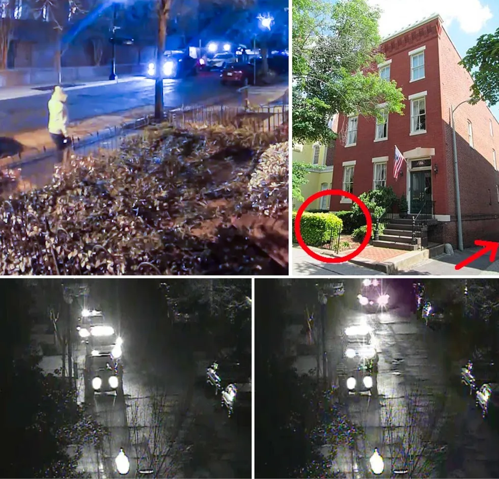 The pipe bomb suspect (above left) walking west on C Street toward Rumsey Court, stopping in front of a congressional rooming house (upper right), possibly looking to place a pipe bomb on Jan. 5, 2021. Capitol Police squad cars (below) with lights engaged were across the street as the suspect walked down the court to plant the bomb. FBI/@Armitas/U.S. Capitol Police CCTV