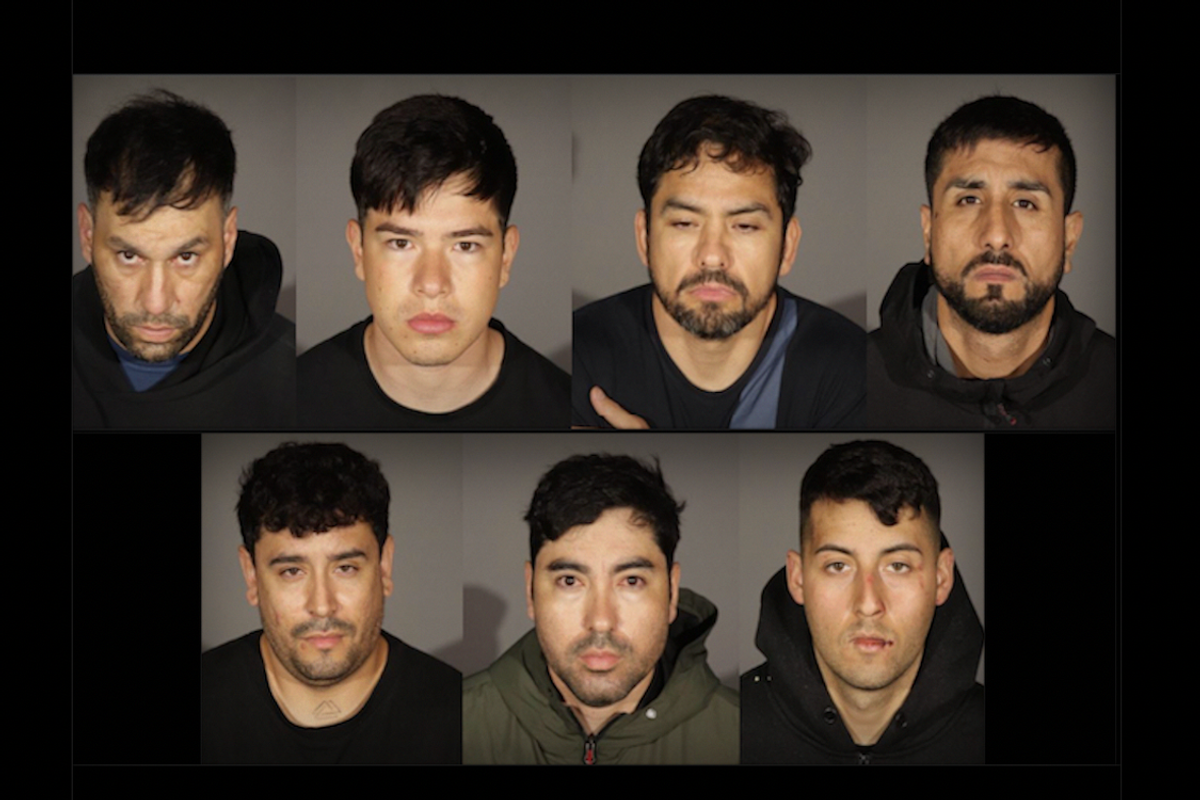 The arrested males appear below in a composite photo from Glendale police. According to KTLA-TV, they are: (top row, L to R) Edson Gonzalez, Victor Iturriaga Lopez, Cristian Gonzalez Aburto, Jose Millafil; (bottom row, L to R) Luka Pazitiani, Vera Matias, Javier Sepulveda.