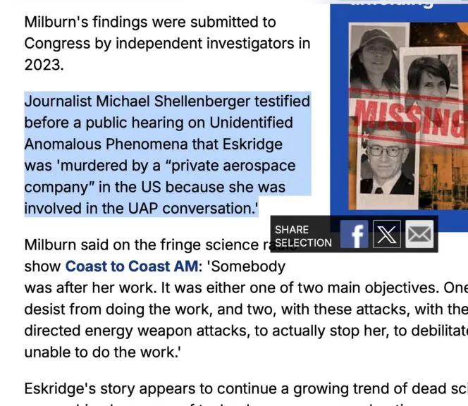 For example, as you can see here, The Daily Mail reported, “Journalist Michael Shellenberger testified before a public hearing on Unidentified Anomalous Phenomena that Eskridge was ‘murdered by a private aerospace company in the US because she was involved in the UAP conversation.'”