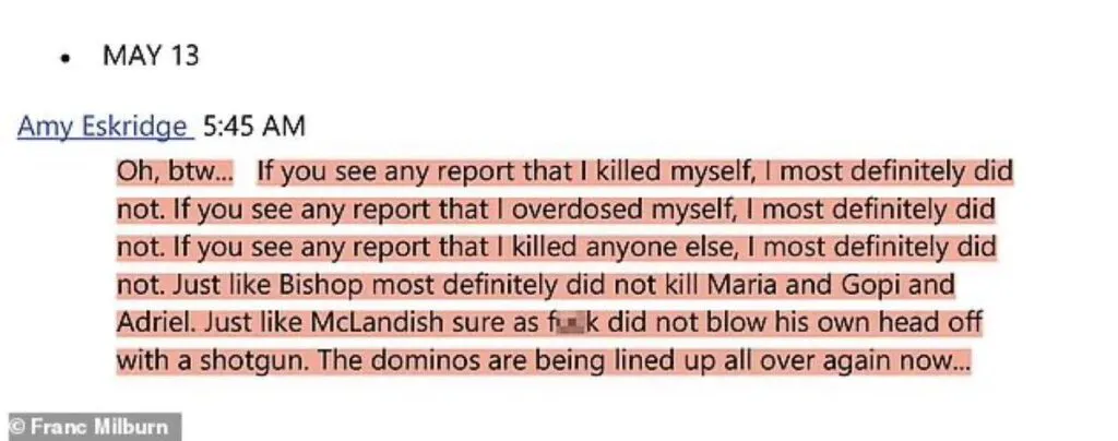 The alleged text read, in part: “If you see any report that I killed myself, I most definitely did not. If you see any report that I overdosed myself, I most definitely did not … The dominos are being lined up all over again now.”