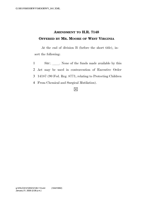 “None of the funds made available by this Act may be used in contravention of Executive Order 14187 (90 Fed. Reg. 8771; relating to Protecting Children From Chemical and Surgical Mutilation,” a copy of the amendment shared with The Daily Wire reads.