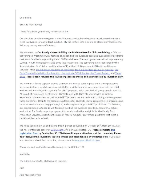 A representative from the organization wrote it was unable to attend the October 2024 meeting but hoped they could “remain in touch to identify future ways we can partner together to advance our shared goals,” emails show. In response, Kruse set up a personal meeting between the Funders for LGBTQ Issues, the Administration for Children and Families, and Weeks.