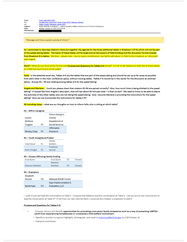 Angela Weeks, director of the National Sexual Orientation, Gender Identity & Expression Center, was instrumental in setting up the event. On October 13, she sent an email to participants explaining how the “Partnership Speed Matching” would work.