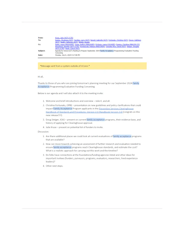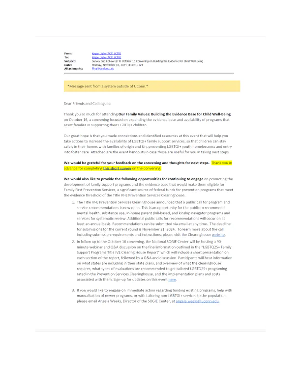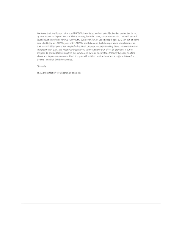 “Our great hope is that you made connections and identified resources at this event that will help you take actions to increase the availability of LGBTQI+ family support services, so that children can stay safely in their homes with families of origin and kin, preventing LGBTQI+ youth homelessness and entry into foster care,” wrote Kruse.