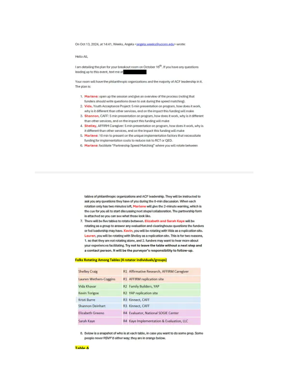 “You will rotate between tables of philanthropic organizations and ACF leadership. They will be instructed to ask you and question they have of you during the 8-min discussion. When each rotation only has two minutes left, Marlene will give the 2-minute warning, which is the cue for you all to start discussing next steps/collaboration,” Weeks wrote in the email. “Try not to leave the table without a next step and a contact person. It will be the purveyor’s responsibility to follow-up.”