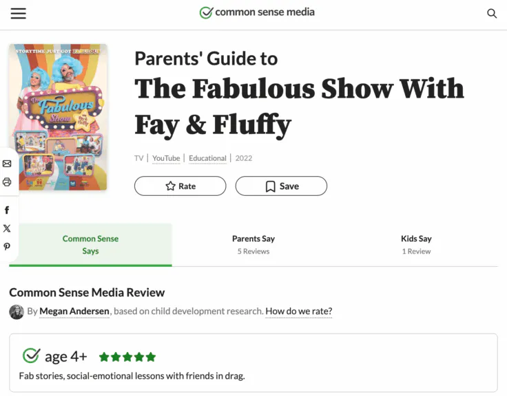 Common Sense Media, a California nonprofit with a stated mission to protect kids online, gave a children’s show featuring two male drag queens a perfect child safety score and recommended it for kids ages 4 and up. “The Fabulous Show With Fay & Fluffy” received a 5/5 star rating and was praised for offering positive role models, having educational value, and showcasing diversity.