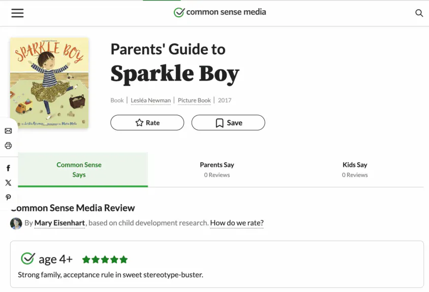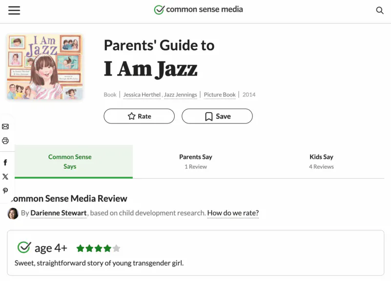 The group recommends transgender content for 4-year-olds, including “I Am Jazz,” which it calls a “Sweet, straightforward story about a transgender girl.” It also recommends “Jacob’s New Dress,” a story about a young boy who likes to crossdress and was written by parents of a “gender-non-confirming child,” and “Sparkle Boy,” the story of a 3-year-old boy who “loves all the glittery stuff his older sister loves” and “causes a stir” when he crossdresses.