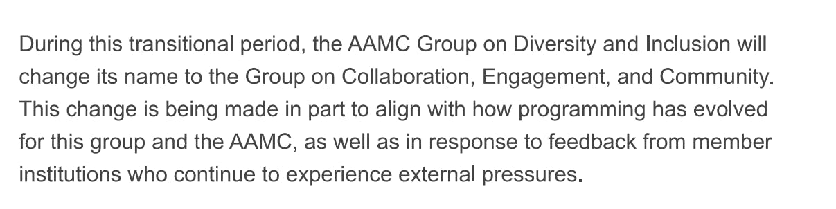 “This change is being made in part to align with how programming has evolved for this group and the AAMC, as well as in response to feedback from member institutions who continue to experience external pressures,” the email said