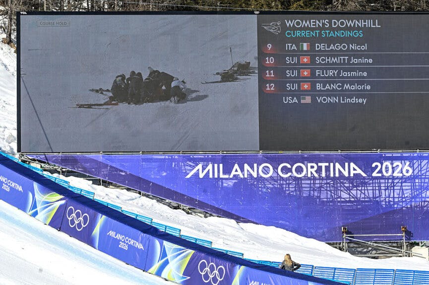A giant screen shows US’ Lindsey Vonn receiving assistance after a crash in the women’s downhill event during the Milano Cortina 2026 Winter Olympic Games at the Tofane Alpine Skiing Centre in Cortina d’Ampezzo on February 8, 2026. (Photo by Tiziana FABI / AFP via Getty Images)