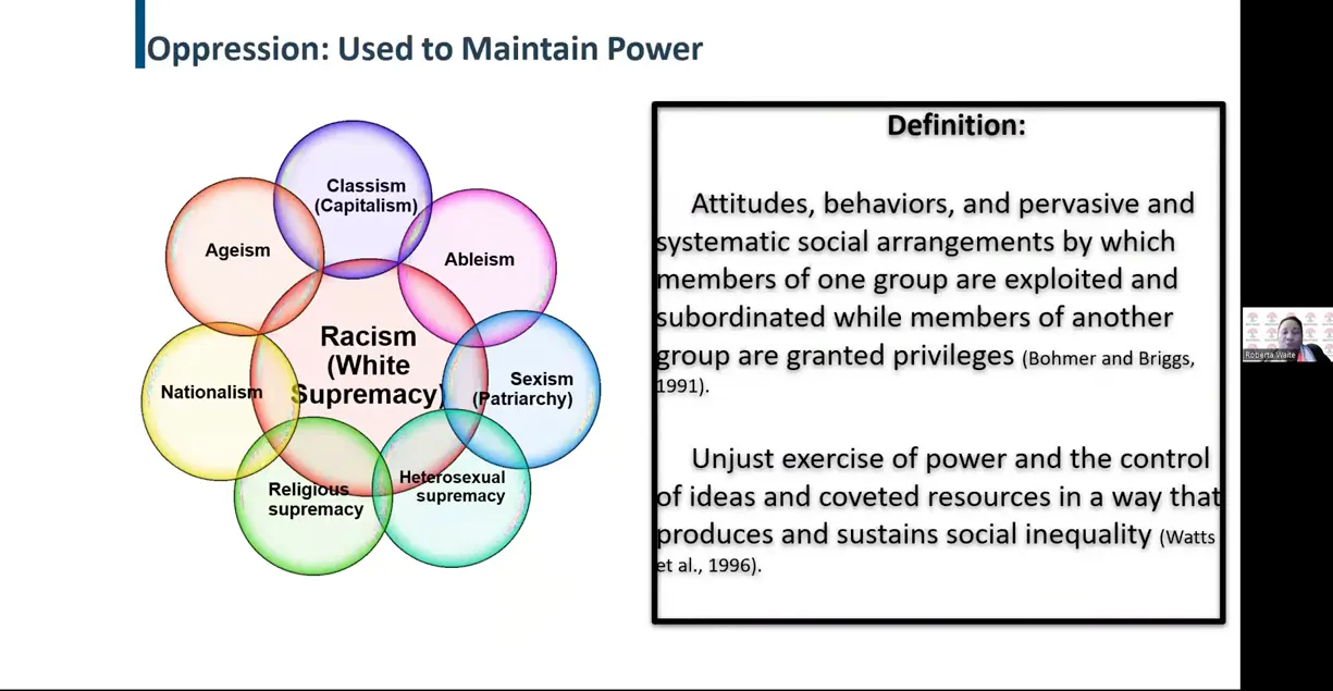 Starting in March 2022, the ANA rolled out a series of trainings called “Equity in Action: Dismantling Racism in Nursing.” During one session, Georgetown dean of nursing Roberta Waite gave a presentation on “How do we ensure health equity in a society built on white supremacy and oppression?” Waite shared a slide placing “white supremacy” at the center of oppression surrounded by things like “capitalism,” “nationalism,” “religious supremacy,” “patriarchy,” and “heterosexual supremacy.”