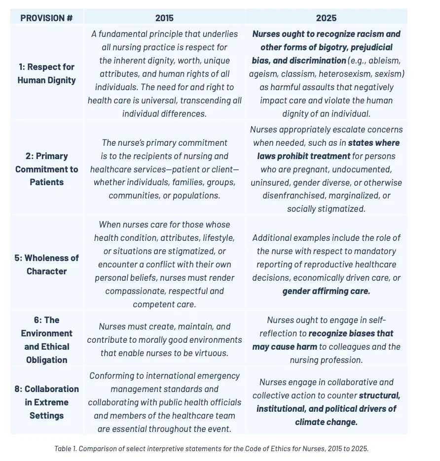 As documented by Do No Harm, interpretive statements in the ANA’s code of ethics for nurses have been updated from 2015 to 2025 to include political language. For example, the “Respect for Human Dignity” statement was updated with language on “ableism, ageism, classism, heterosexism, sexism,” and a statement of commitment to patients asserts that states have laws that “prohibit treatment for persons who are pregnant, undocumented, uninsured, gender diverse, or otherwise disenfranchised, marginalized, or socially stigmatized.”