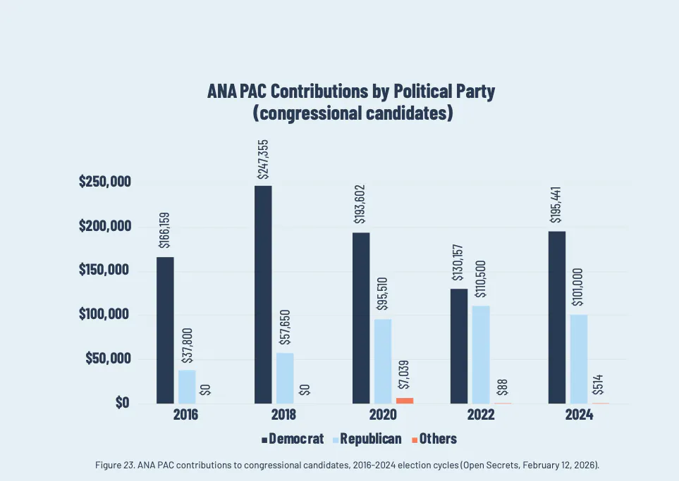 The ANA’s political action committee also has a history of donating more money to Democratic candidates.