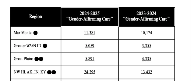 Examples of increases included Planned Parenthood Great Northwest, Hawaii, Alaska, Indiana, and Kentucky reporting 24,295 “gender-affirming care” services in 2025, up from 13,432 in 2024. Planned Parenthood of Greater Ohio reported 8,644 transgender services in 2025, up from 6,206 in 2024.