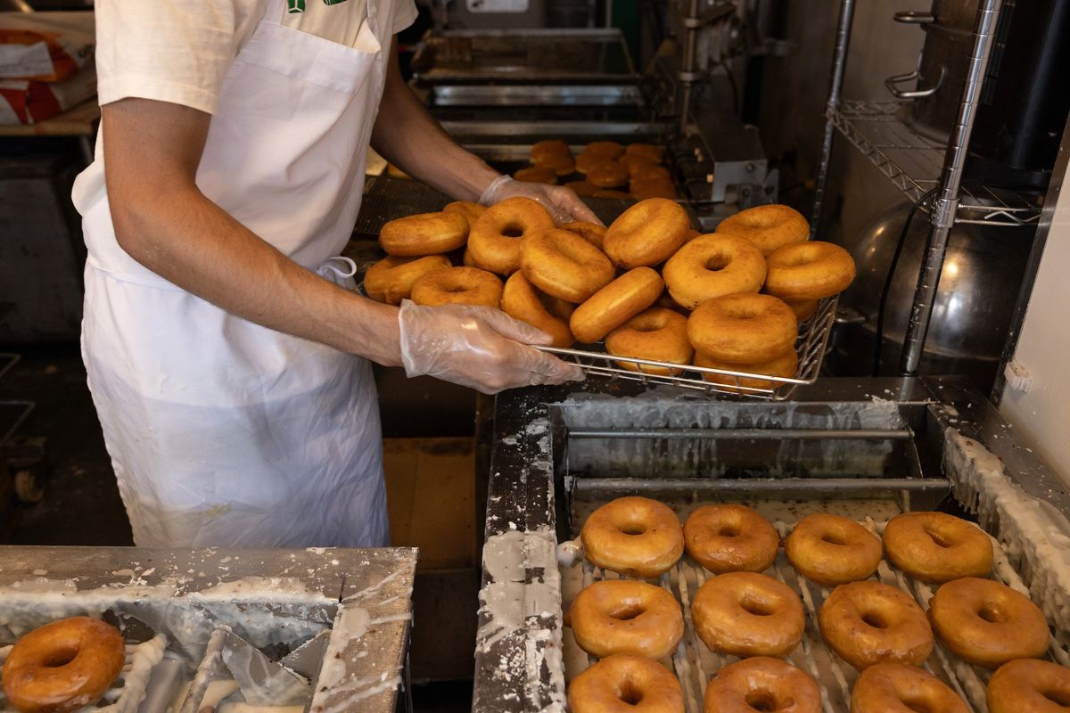 The incident unfolded at a Winchell's donut shop in the Harvard Heights area on May 28. Video obtained by KMPH-TV shows the bikini-clad man in the kitchen pointing what looks like a gun while the workers toss objects at him, including cash.