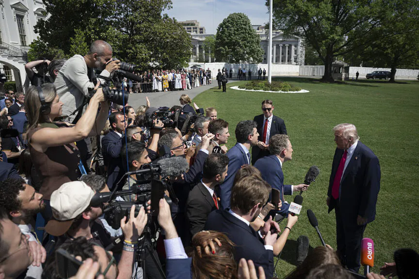 President Donald Trump speaks to the Press before departs at the White House to Las Vegas, Nevada on April 16, 2026, in Washington DC. (Photo by Celal Gunes/Anadolu via Getty Images)