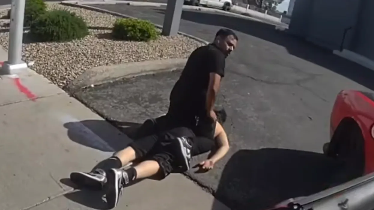 The motorist then sat on the suspect's back, restraining him, until an arresting officer arrived on the scene and placed the suspect in handcuffs.