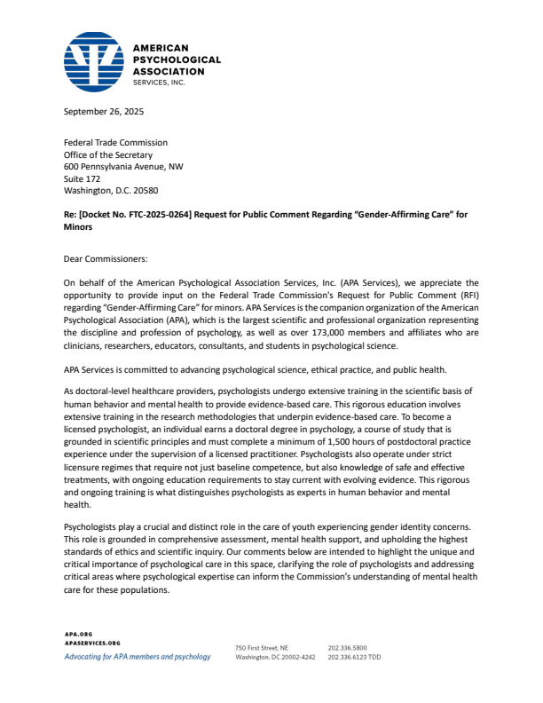 In a September 2025 letter to the Federal Trade Commission — which is actively investigating unfair and deceptive practices within the field of pediatric “gender affirming care” — the APA downplayed its support of “gender affirming care,” stating the primary role of a therapist treating children with gender dysphoria is assessment, not affirmation.